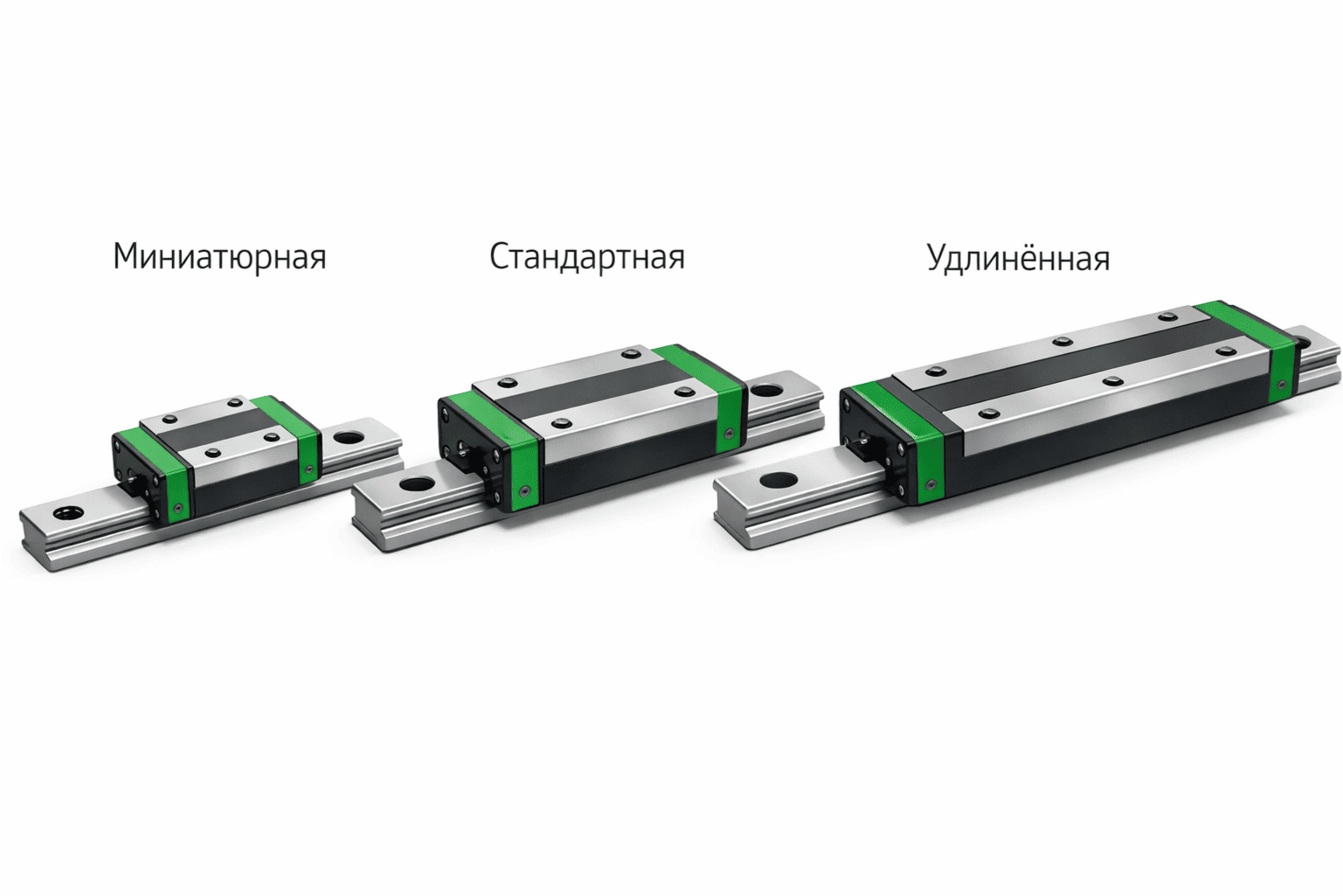 Размеры кареток ориентированы на станочный парк - в основном это стандартные параметры, которые обеспечивают максимальную прочность и прецизионную настройку. Для работы с тяжёлыми заготовками разработаны каретки с увеличенной высотой. Удлинённые используются для работы с массивными заготовками и при повышенных нагрузках. Для максимально нагруженных систем обычно применяют широкие модели с фланцами. Конкретный тип каретки определяется по требованиям к точности детали, параметрам перемещаемых инструментов и заготовок, уровню нагрузки.